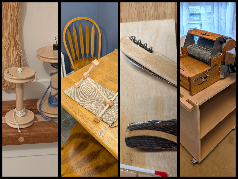 The second project was a cart for my beautiful and talented wife’s new shop tool, an electric drum carder. A drum carder is used to process fibers from sheep, plants, and other animals into clean organized rolls of fiber that can be spun into yarn. I built the cart for her “shop” the same way as I do for my shop, screwed together out of 3/4” natural birch plywood with a single fixed shelf inside for rigidity and a 1/4” natural birch plywood back. It is on locking heavy duty casters.